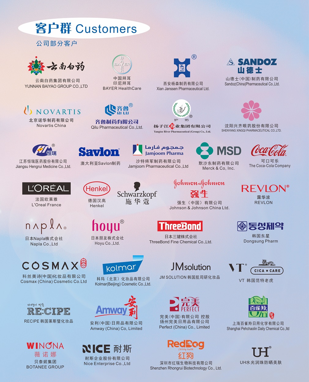 Some quality customers: Janssen, Novertis, Bayer, YunNanBaiYao, Coca-Cola, L'Oreal, Henkel, Revlon, Johnson & Johnson, Hoyu, Amway, Perfect, Cosmax.
