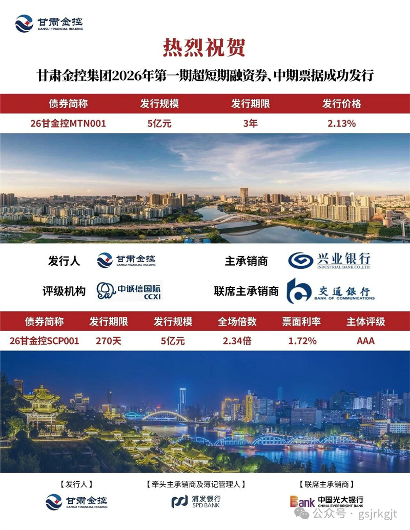 近日,甘肅金控集團成功發行2026年第一期超短期融資券,規模5億元,期限270天,票面利率1.72%,創集團債券發行利率歷史新低;同期成功發行2026年第一期中期票據,發行規模5億元,期限3年,票面利率2.13%,刷新集團中期票據發行利率最低記錄。