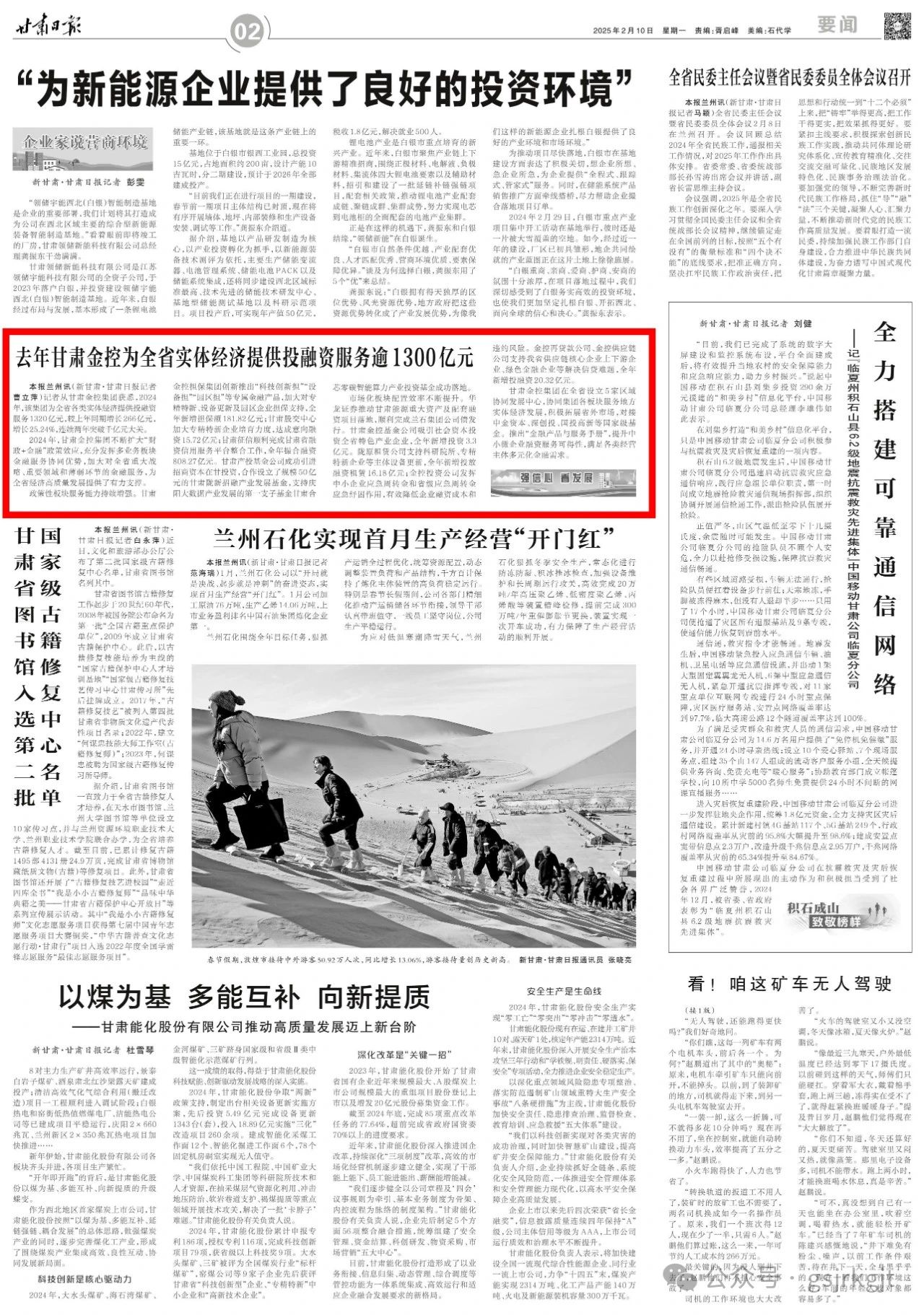 2024年,甘肅金控集團(tuán)不斷擴(kuò)大“財(cái)政+金融”政策效應(yīng),充分發(fā)揮多業(yè)務(wù)板塊金融服務(wù)協(xié)同優(yōu)勢,加大對全省重大戰(zhàn)略、重要領(lǐng)域和薄弱環(huán)節(jié)的金融服務(wù),為全省經(jīng)濟(jì)高質(zhì)量發(fā)展提供了有力支撐。