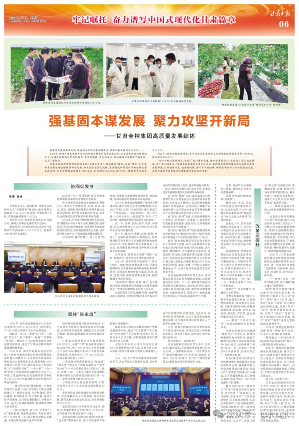 “這一目標任務的確定,體現了我們穩中求進、進中提質的信心,也體現了我們跳起摸高、實干爭先的決心。”甘肅金控集團相關負責人表示,集團將堅決貫徹落實省委省政府各項決策部署,以昂揚的斗志、飽滿的熱情、苦干實干的精神,確保全年各項工作任務圓滿完成,為奮力譜寫中國式現代化甘肅篇章貢獻金控力量。