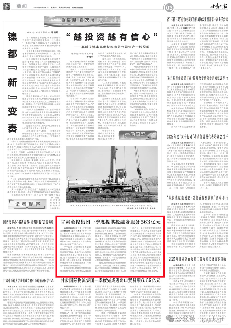 媒體關注 | 甘肅金控集團一季度提供投融資服務563億元