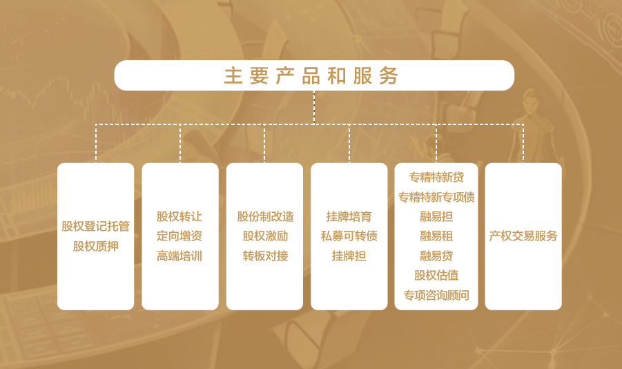 經(jīng)營范圍包括:為非上市企業(yè)的股權(quán)登記、托管、轉(zhuǎn)讓、交易、融資、結(jié)算、過戶、分紅、企業(yè)規(guī)范、培育等提供場所和服務;組織和監(jiān)督股權(quán)托管交易活動;發(fā)布市場交易信息;為非上市公司進場掛牌提供融資、咨詢等綜合服務;為各類企業(yè)提供股權(quán)轉(zhuǎn)讓及增資擴股、實物資產(chǎn)、債權(quán)、不良資產(chǎn)和集中采購等產(chǎn)權(quán)交易業(yè)務服務,以及政策咨詢、方案設計、項目推介、資產(chǎn)盡調(diào)等增值服務。